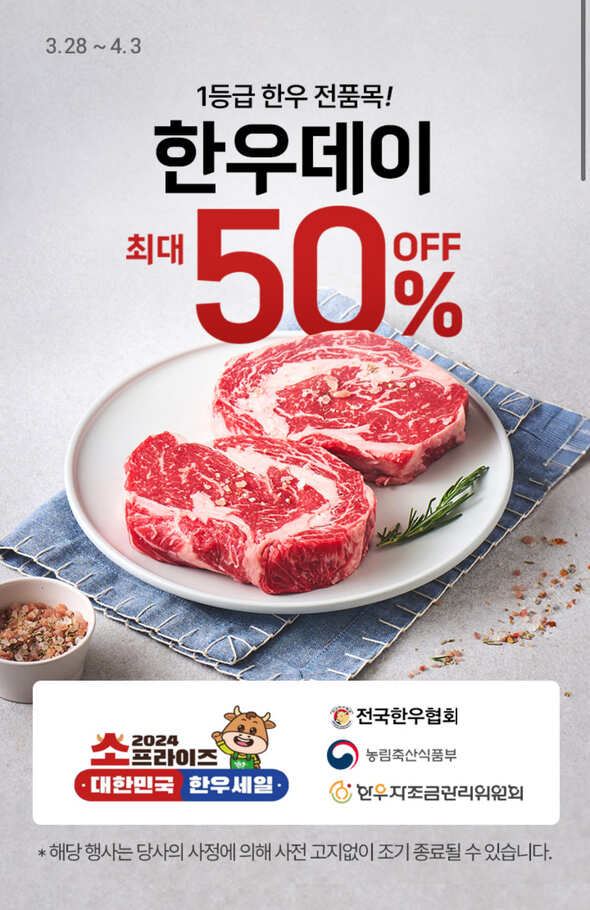 특히 3월 23일부터 4월 3일까지는 한우와 대게가 50% 반값행사를 진행합니다. 할인 방법과 품목 등 세일 정보에 대해 자세히 알아보겠습니다.