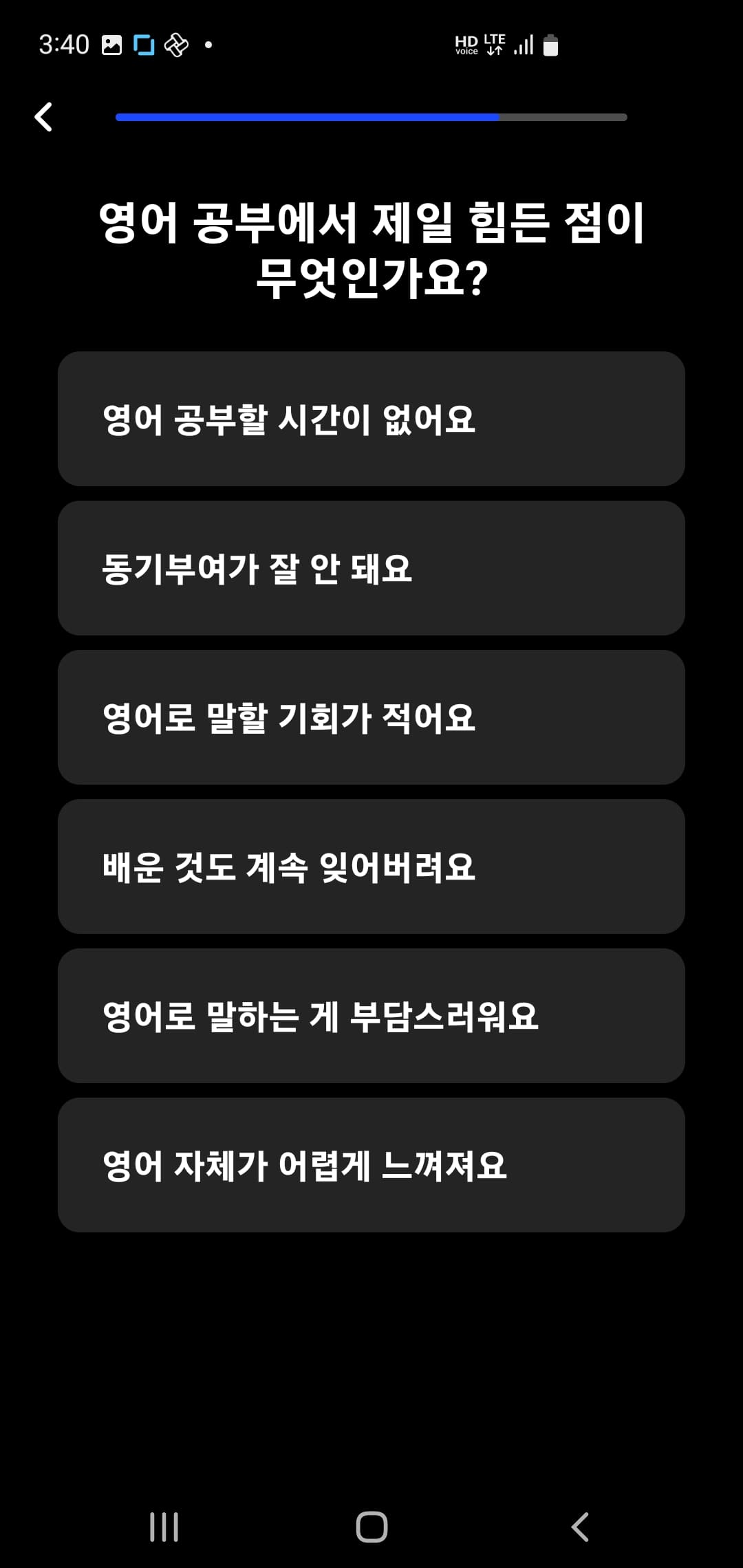 스픽 영어는 시작 시 관심있는 분야와 레벨에 대해 설정하는 부분을 거쳐 수준별 강의를 제공합니다. 간단한 설문조사들을 통해 이루어지며 설정된 레벨과 관련된 강의들이 화면에 보이게 됩니다.
