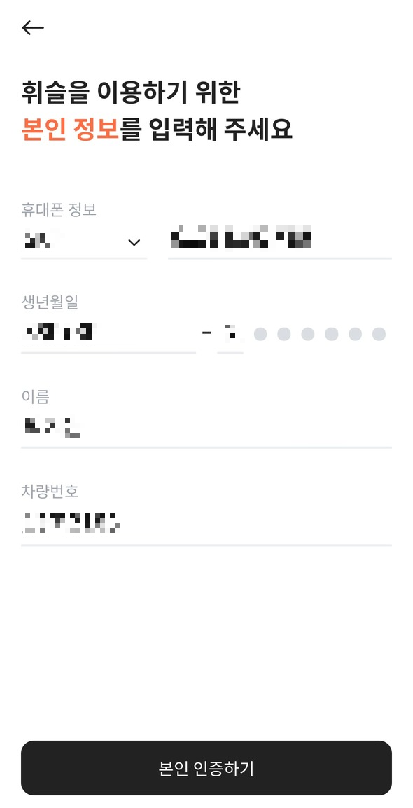 휘슬 앱을 설치하셨다면 다음 과정대로 본인 인증을 통해 서비스에 가입하실 수 있습니다. 본인인증만 진행하면 자동으로 가입되며 가입 시 본인의 차량번호를 입력하여 차량번호 기반으로 주차 단속 알림을 받을 수 있습니다. 핸드폰 번호를 통한 본인인증이 진행되며 차량 번호 입력과 차량의 명의를 선택하고나면 회원가입 및 차량등록이 완료됩니다.