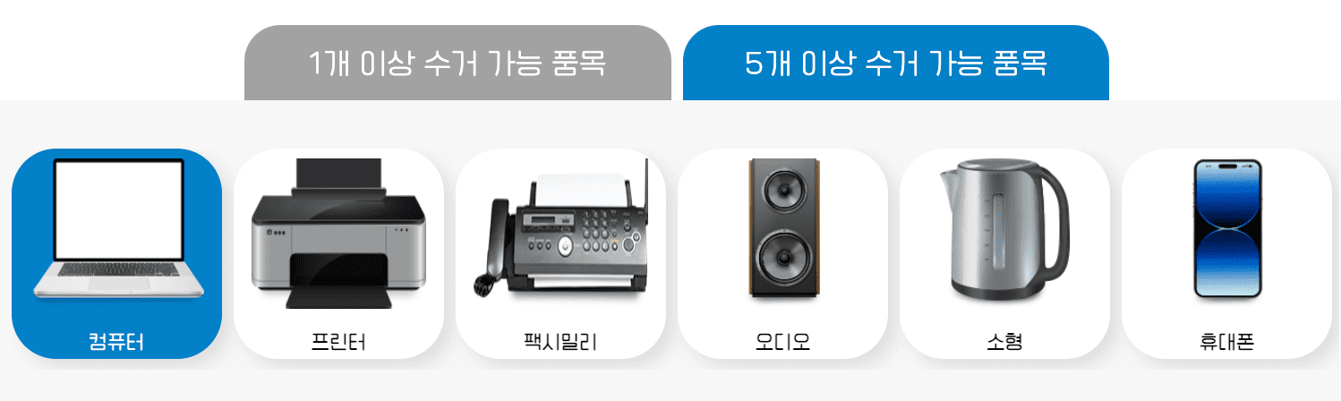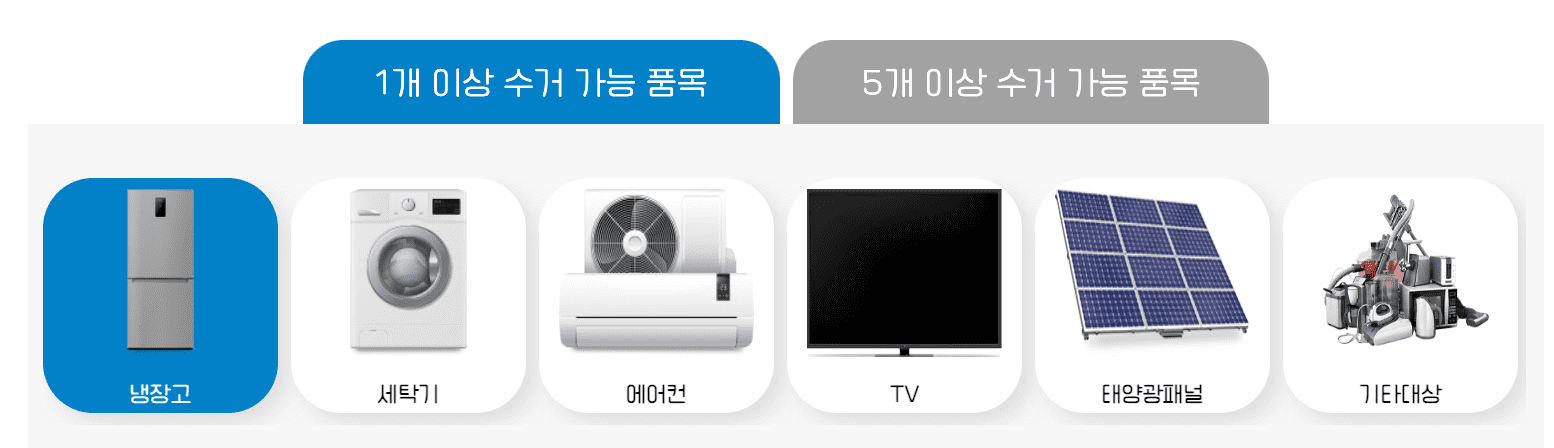 수거가능한 폐가전 품목으로는 단일 수거 신청이 가능한 품목과 5개이상 수거신청을 했을 때 수거신청이 가능한 품목이 있습니다.
