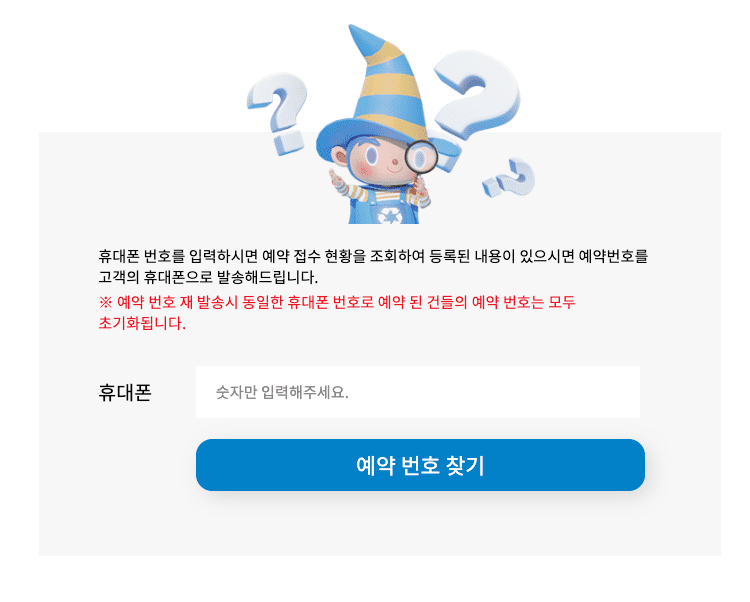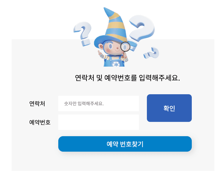 조회는 연락처 및 예약번호를 통해 가능하며 예약번호를 잊으신 경우에도 신청하신 핸드폰 번호로 쉽게 예약번호를 찾으실 수 있으니 걱정하지 않으셔도 됩니다.