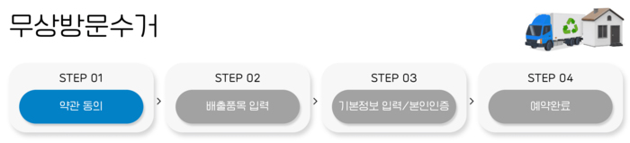 ▶ 온라인 수거 예약 -> 배출품목 입력 -> 기본정보입력/본인인증 -> 예약완료 -> 제품방문 수거