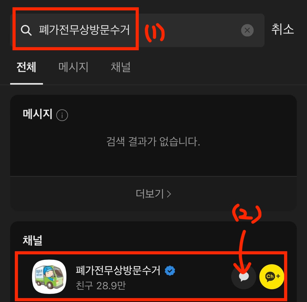 폐가전 무상 방문수거 예약은 카카오톡을 통해서도 간편하게 신청하실 수 있습니다. 카카오톡의 상단 부분에 돋보기 모양을 클릭하셔서 "폐가전무상방문수거" 라고 검색하시면 아래처럼 채널에 해당 서비스의 챗봇을 확인하실 수 있습니다.